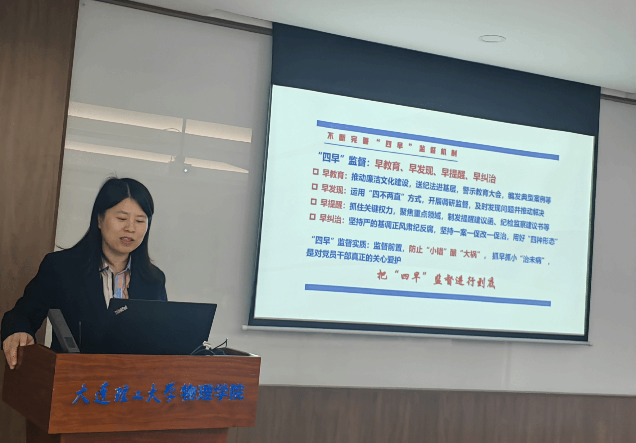 接下来,由孟秀英同志为大家展开名为“学纪、知纪、明纪、守纪,团结奋进助推学校事业加速卓越”的主题讲座,为了使在场党员干部明确开展党纪学习教育的意义,孟秀英同志引用2022年3月习近平总书记在中央党校(国家行政学院)中青年干部培训班开班式上的讲话:“年轻干部必须牢记清廉是福、贪欲是祸的道理,经常对照党的理论和路线方针政策、对照党章党规党纪、对照初心使命,看清一些事情该不该做、能不能干,时刻自重自省,严守纪法规矩。”来进一步强调广大党员干部要时刻保持清醒头脑,坚定的走在反腐倡廉的路上。
