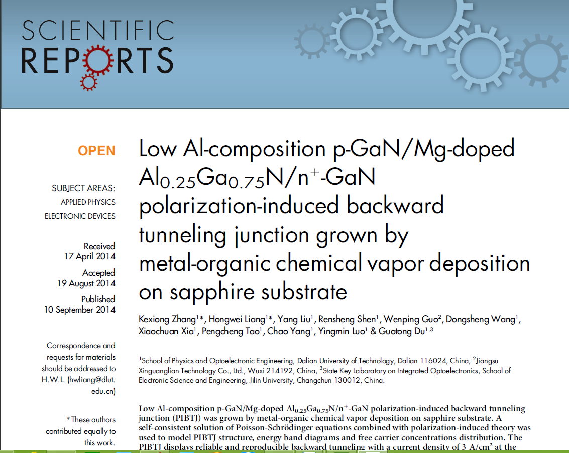 近日,新葡的京集团8814检测站物理与光电工程学院博士研究生张克雄与梁红伟副教授(通讯作者)为共同第一作者的以“Low Al-composition p-GaN/Mg-doped Al0.25Ga0.75N/n+-GaN polarization-induced backward tunneling junction grown by metal-organic chemical vapor deposition on sapphire substrate”为题的论文在Nature 出版集团的综合性期刊Scientific Reports上发表,该论文是张克雄同学在杜国同教授及梁红伟副教授指导下完成的。文章链接为:。