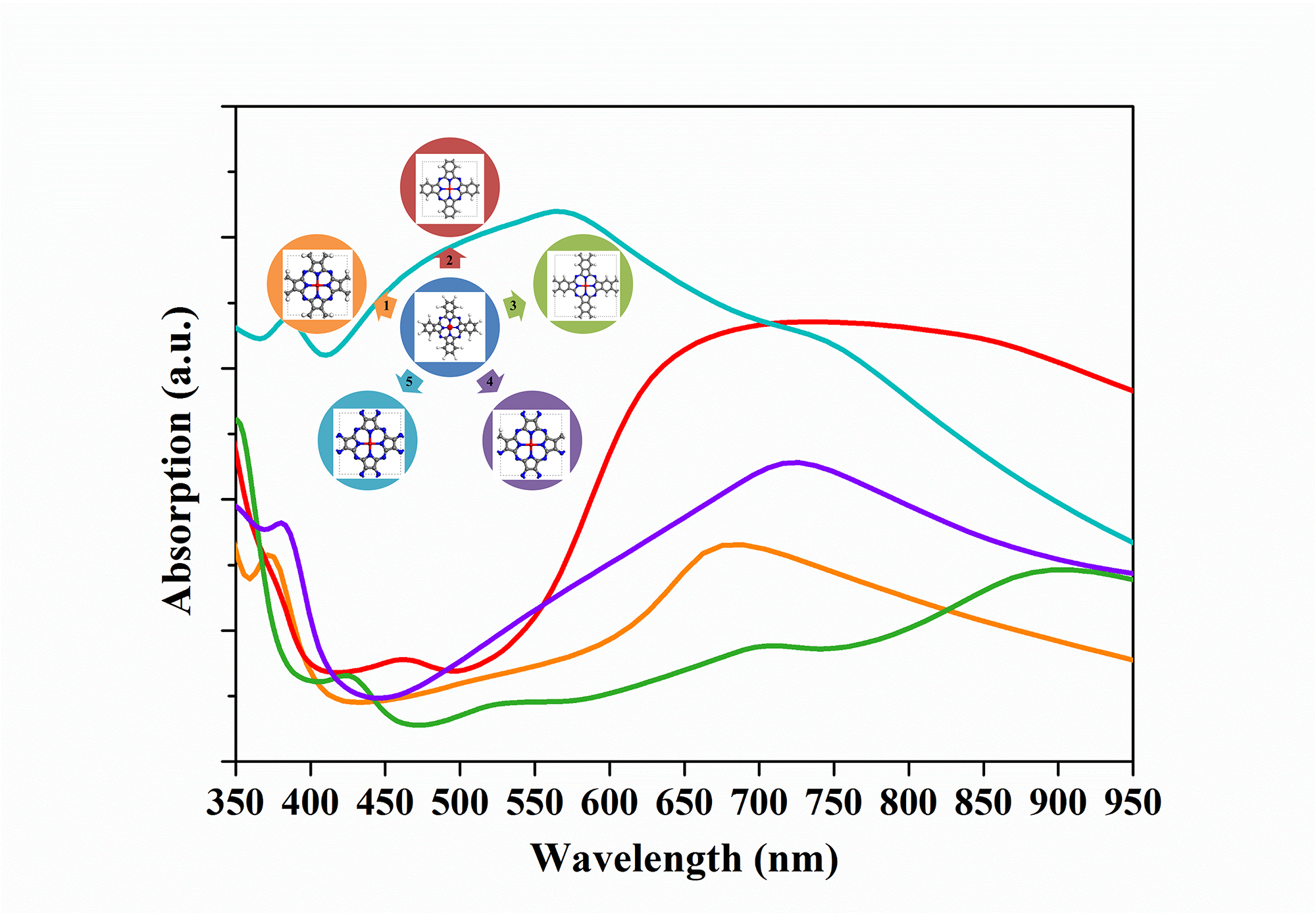 有机太阳能电池具有柔性、轻质、价格低廉、易于加工等优点,具有巨大的商业应用价值。但低的稳定性、能量转化效率以及载流子迁移率大大限制了其广泛应用。为了克服上述缺点,赵纪军教授课题组率先关注到基于酞菁分子的二维有机晶体材料。主要原因如下:(1)酞菁分子是第一个被报道存在光伏效应的有机分子并且在600-800 nm区间具有高的消光系数;(2)超过70种金属原子可以担载在酞菁分子中,可以表现出P型或者N型半导体的特征;(3)跟有机小分子和聚合物相比,二维有机晶体材料有序、具有更好的结构稳定性以及更高的载流子迁移率;(4)根据合成化学,二维有机晶体材料的光电特性主要取决于其构造单元,并易于受到合成方法、反应类型、功能团等多种因素的调控;(5)应用分子自组装方法,二维铁酞菁材料已经成功在惰性衬底上合成。
