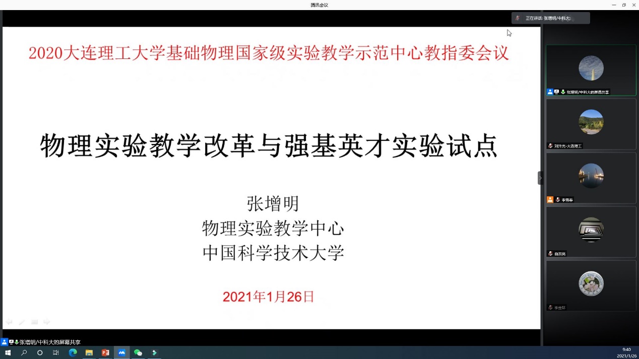 2020年1月26日,基础物理国家级实验教学示范中心(新葡的京集团8814检测站)教学指导委员会2020年年会通过腾讯会议的方式在线上召开。中心教学指导委员会主任、中国科技大学张增明教授、中心教学指导委员会委员华中科技大学熊永红教授、山东大学徐建强教授、东北师范大学李金环教授、新葡的京集团8814检测站余虹教授、新葡的京集团8814检测站李雪春教授以及实验中心的全体教师参加了会议。我校教务处副处长徐立昕教授、新葡的京集团8814检测站副院长于长水教授出席会议。