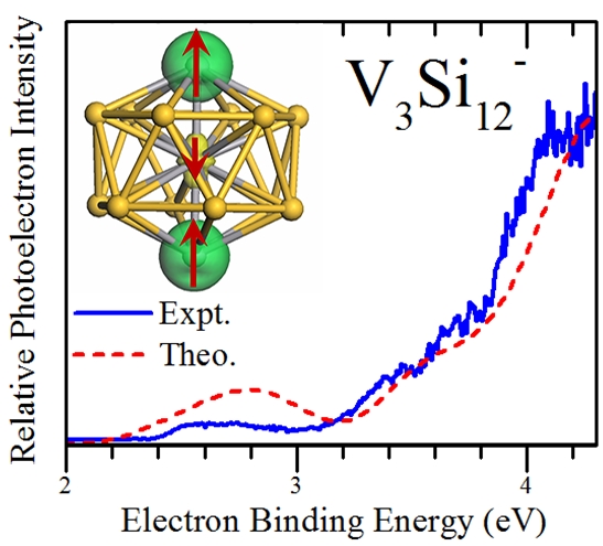 该研究运用基于第一性原理的遗传算法全局搜索,结合光电子谱实验,研究了一个到三个V原子掺杂Si12团簇的结构和性质,发现V3Si12-负离子团簇具有车轮状的双帽反六棱柱结构,并表现出有趣的亚铁磁性,总磁矩为4 μB。在此基础上,还可以构造V-Si的一维亚铁磁性纳米线,有望作为未来纳米自旋电子学器件的构造单元。本研究得到了国家自然科学基金的资助。