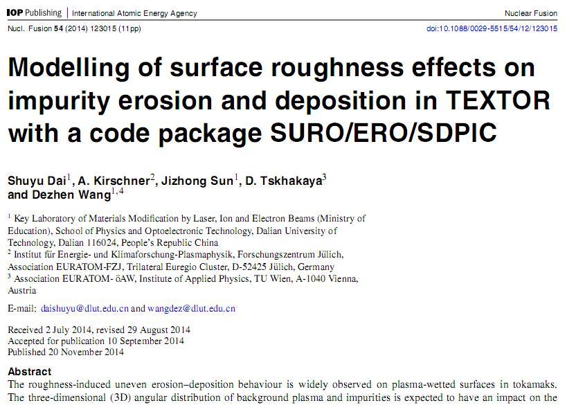 近日,新葡的京集团8814检测站青年教师戴舒宇关于核聚变装置中粗糙表面上杂质输运和沉积的三维模拟研究成果最终发表在国际核聚变领域最具权威期刊《核聚变》(Nuclear Fusion)。这篇文章经过4位审稿人的严格评阅,最后得到了他们对工作的一致肯定,其中一位审稿人还给出了"excellent paper"的评价。这项研究成果的开展是建立在之前的二维模型基础上开展的(Dai S Y et al 2013 PPCF 55 055004),该二维模型的文章被欧洲同行多次引用;最新的三维模型的模拟结果与TEXTOR和Tore Supra等聚变装置上的实验结果有很好地吻合,这也为后续的工作的开展打下了良好的基础。此外,该项工作也得到了王德真教授和孙继忠教授的支持和帮助。《核聚变》期刊是由国际原子能机构主办的可控核聚变领域的顶级杂志。我国每年在该期刊发表的文章在10篇左右,并且主要以实验文章为主。本研究工作得到了ITER专项基金、国家自然科学基金、中国博士后科学基金、辽宁省高等院校科学研究项目的联合资助。