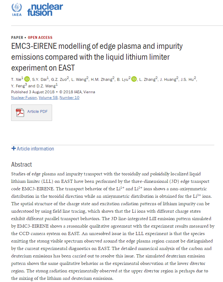近日,新葡的京集团8814检测站等离子体物理专业博士生谢添在王德真教授和戴舒宇副教授指导下的最新科研成果(核聚变装置EAST中边界锂杂质输运和辐射的三维模拟研究)发表于核聚变领域顶级期刊Nuclear Fusion。从文章正式发表至今,短短不到一个月的时间内,文章的下载量和阅读量成为了Nuclear Fusion期刊Most read排行榜的第一名。具体图文如下: