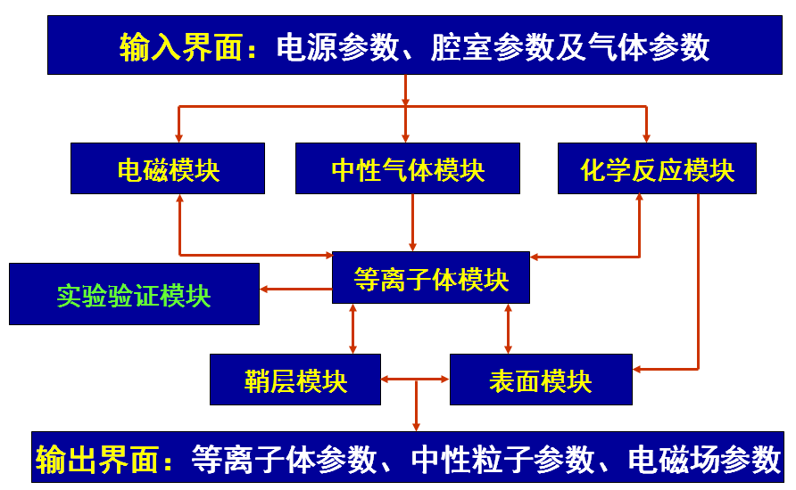 MAPS是一款专门面向等离子体工艺腔室的数值模拟软件平台,可以同时为等离子体工艺腔室的参数设计和表面处理工艺(材料刻蚀和薄膜沉积)的结果预测提供模拟服务。基于不同的等离子体模型,MAPS包含不同的数值模拟方法,如粒子/蒙特卡洛碰撞模拟方法、流体力学模拟方法、流体力学/蒙特卡洛碰撞混合模拟方法、整体模型模拟方法等。软件平台包含输入部分、输出部分以及七大模块,分别是等离子体模块、中性气体模块、电磁模块、鞘层模块、化学反应模块、表面模块、以及实验验证模块。