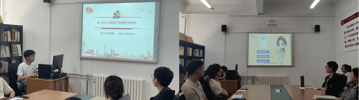 会议第一项,由周杨同志带领大家学习新修订的《中国共产党纪律处分条例》(以下简称《条例》)。首先,周杨同志介绍了《条例》制定的目的和意义,提醒支部党员要明确是非界限、清楚自律标准、守住行为底线。接下来,周杨同志带领大家深入学习了《条例》的详细内容,重点讲解了对于党员违反政治纪律、组织纪律、廉洁纪律、群众纪律、工作纪律以及生活纪律的处分,以及对违反党的纪律典型案例进行分析。最后,全体党员一同观看“党纪学习教育这些要点要牢记——《中国共产党纪律处分条例》学习教育微视频第一集”。