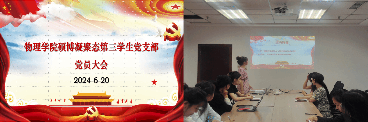 为全面落实学校和学院党委对开展党纪学习教育的部署,2024年6月20日,新葡的京集团8814检测站硕博凝聚态第三学生党支部在科技园写字楼C座510会议室召开党员大会暨“学条例,正身行”主题党日活动,本次活动由党支部书记赵博同志主持,支部全体党员积极参与。
