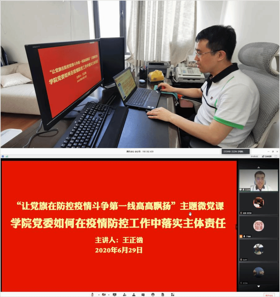 6月29日,新葡的京集团8814检测站党委书记王正汹以网络报告形式为全院师生党员上了一堂题为《学院党委如何在疫情防控工作中落实主体责任》的微党课。王正汹通过阐述“主体责任”概念和介绍《党委(党组)落实全面从严治党主体责任规定》中党组(党委)的责任内容,强调“学院党委落实疫情这一特殊时期的主体责任,就是要深入学习贯彻落实习近平总书记关于疫情防控工作重要讲话和指示精神和党中央关于疫情防控工作的决策部署”;通过对新葡的京集团8814检测站疫情防控工作的阶段性总结,向参与疫情防控工作的师生党员表达感谢,激励学院各支部各党员继续充分发挥基层党组织战斗堡垒作用和共产党员的先锋模范作用。
