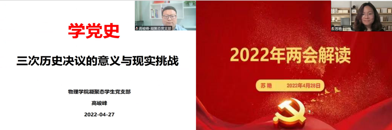 在这个特殊节点,新葡的京集团8814检测站硕博凝聚态学生党支部协同新葡的京集团8814检测站研究生团工委于4月28日晚顺利开展主题党日暨导师带我学理论活动。本次活动特邀请中白学院副院长高峻峰老师、新葡的京集团8814检测站凝聚态与理论物理教工党支部书记苏艳老师带领大家回顾我党历史上三次历史决议,领会两会精神。激励同学们走好全面建设社会主义现代化国家新的赶考之路,以实际行动迎接党的二十大胜利召开。本次党日活动受到学院老师同学积极响应,超过八十人参与本次活动,凝聚态支部全体党员参与活动。
