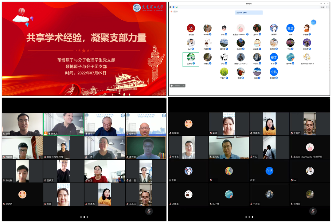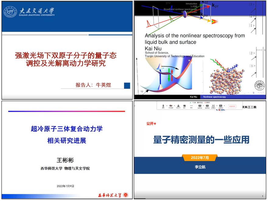 为鼓励理论研究和学术创新,开阔学生知识视野,给予大家更多相互交流的机会。受新葡的京集团8814检测站副院长韩永昌教授邀请,6月25日大连交通大学牛英煜教授和天津职业技术师范大学牛凯副教授,7月9日西华师范大学王彬彬副研究员和航天二院二十三所李立航中级工程师,先后利用腾讯会议为原子与分子物理专业研究生做学术报告——《强激光场下双原子分子的量子态调控及光解离动力学研究》《Analysis of the nonlinear spectroscopy from liquid bulk and surface》《氦-3+氦-3+碱土金属三体复合产物分布规律理论研究》、《浅谈量子精密测量的一些应用》。讲座活动获得老师和同学们的积极响应,丛书林教授、于杰副教授、程传辉副教授、柴硕副教授、王硕副教授、王高仁副教授等教师及教研室全体研究生参加会议。讲座由韩永昌教授主持,共30人参加。