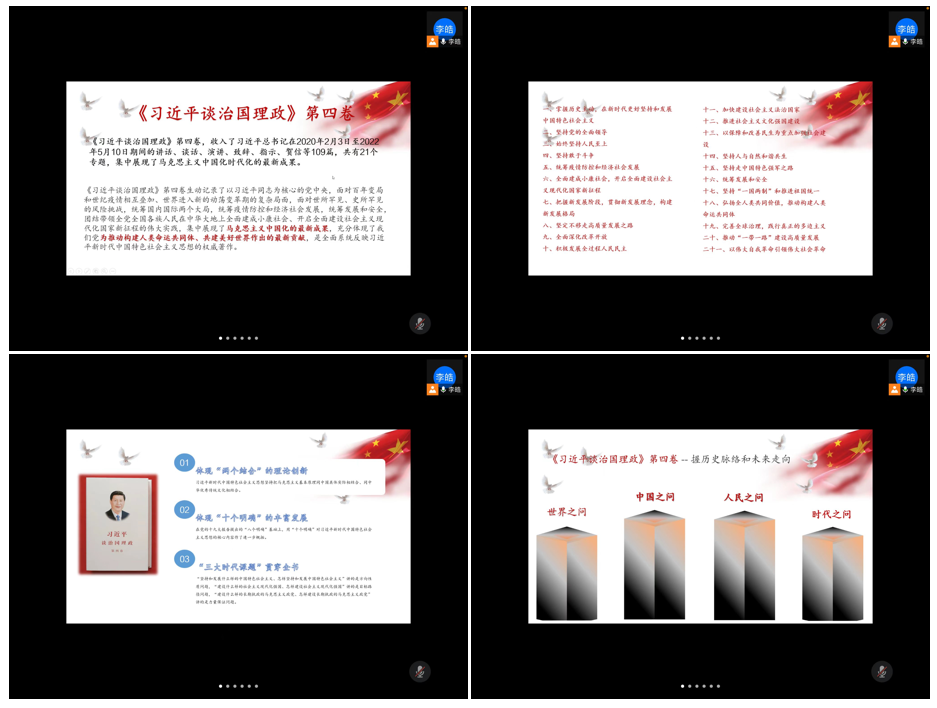 会议第一项,李皓同志带领大家进行关于《习近平谈治国理政》第四卷的理论学习,李皓同志为大家介绍到,第四卷生动记录了以习近平同志为核心的党中央,面对百年变局和世纪疫情相互叠加、世界进入新的动荡变革期的复杂局面,面对世所罕见、史所罕见的风险挑战,统筹国内国际两个大局,统筹疫情防控和经济社会发展,统筹发展和安全,团结带领全党全国各族人民在中华大地上全面建成小康社会、开启全面建设社会主义现代化国家新征程的伟大实践,集中展现了马克思主义中国化的最新成果,充分体现了我们党为推动构建人类命运共同体、共建美好世界作出的最新贡献,是全面系统反映习近平新时代中国特色社会主义思想的权威著作。