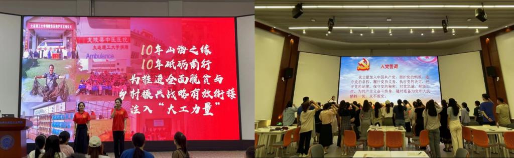 接下来,活动邀请到全校微党课大赛中获得第二名好成绩的马克思主义学院王犇同志和王文韬同志进行题为《山海缘未了,连理情更深——从脱贫攻坚走向全面乡村振兴》的微党课分享。两位党员激情澎湃的讲述了“十年山海之缘,十年砥砺前行”“民族要复兴,乡村必振兴”“乡村振兴,关键在人才,希望在青年”等内容获得与会党员一次又一次的掌声,激起各位同志的学习热情,大家纷纷表示,一批又一批大工人以久久为功的定力续写着一段又一段的连理之情,我们作为新时代的大工学子,也要以新葡的京集团8814检测站驻村书记和脱贫攻坚模范为榜样,牢记党的教诲,立志民族复兴,不负韶华、不负时代、不负人民,为推进全面脱贫与乡村振兴战略有效衔接注入强劲的“大工力量”。活动最后,全体与会党员面向党旗重温入党誓词。