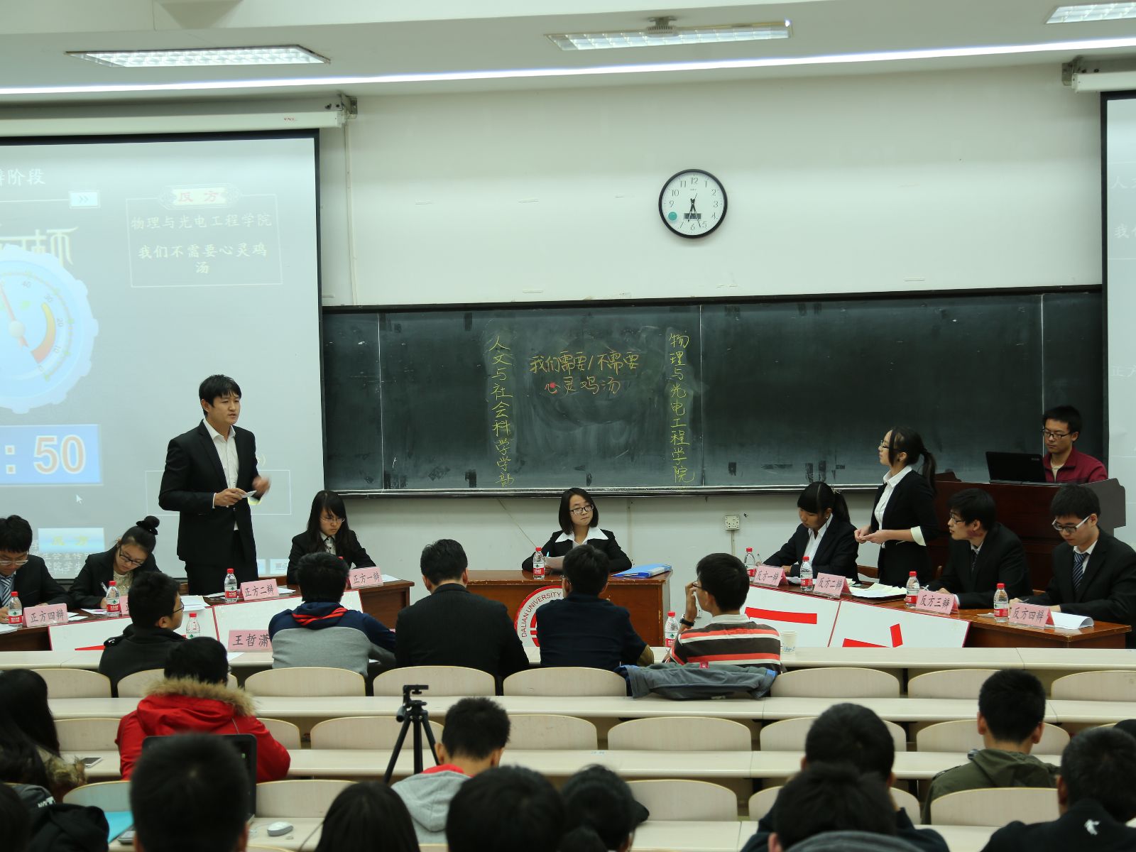 本次辩论,人文与社会科学学部为正方,辩题是“我们需要心灵鸡汤”;物理与光电工程学院为反方,辩题是”我们不需要心灵鸡汤”。正反双方依次在开场视频播放之后入场。