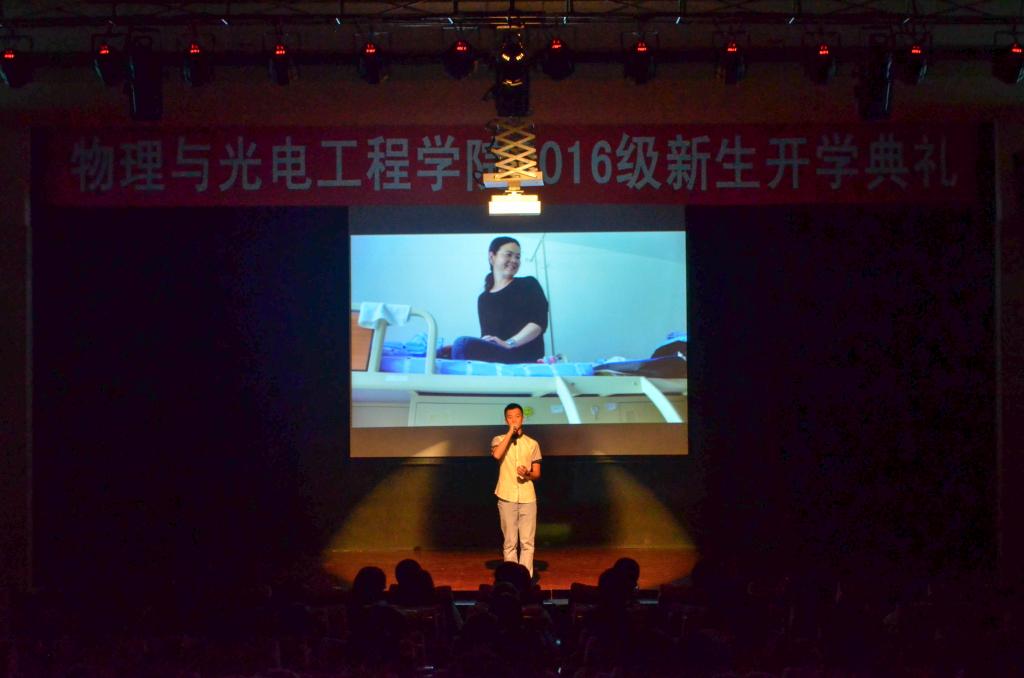 九月二十三号晚,物理与光电工程学院2016级迎新晚会于综合二号楼b301隆重举行,本次晚会由院学生会文化部主办。出席本次活动的有物理与光电工程学院院长赵明山,学院副院长周玲,学院副院长丁洪斌,学院副院长兼党委副书记常亮,学院党委副书记兼副院长杨木,物理系主任、应用物理学专业负责人宋远红,光电中心系主任、光电信息科学与工程专业负责人潘路军,教师代表王正汹,学院党委组织员兼学生工作办公室主任李一鸣,物1603班班主任桑超峰,学院团委书记、2016级本科生辅导员佟西原,2014级本科生辅导员梁勇以及各班代班长。