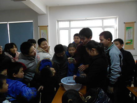 之后,姜欣同学为大家演示了扎不破的气球实验,以及演示了公道杯实验并讲述了它的历史和由来,风趣的讲解和神奇的实验使现场气氛达到高潮;梁勇同学为小朋友展示自制潜水艇的工作原理,让小朋友们了解物理与生活的息息相关。接着,杨博凯同学又带领小朋友一起做可乐瓶不倒的实验,大家纷纷动手,探索其中的奥秘。从此实践活动也在杨博凯同学神奇的小魔术中圆满结束。