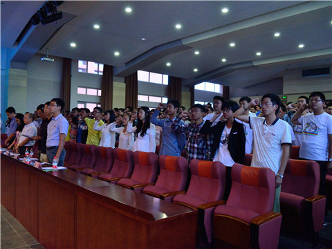 新生代表发言完毕,全体新生在14级辅导员梁勇的带领下进行入学宣誓仪式。最后,全体奏唱校歌,开学典礼礼成。