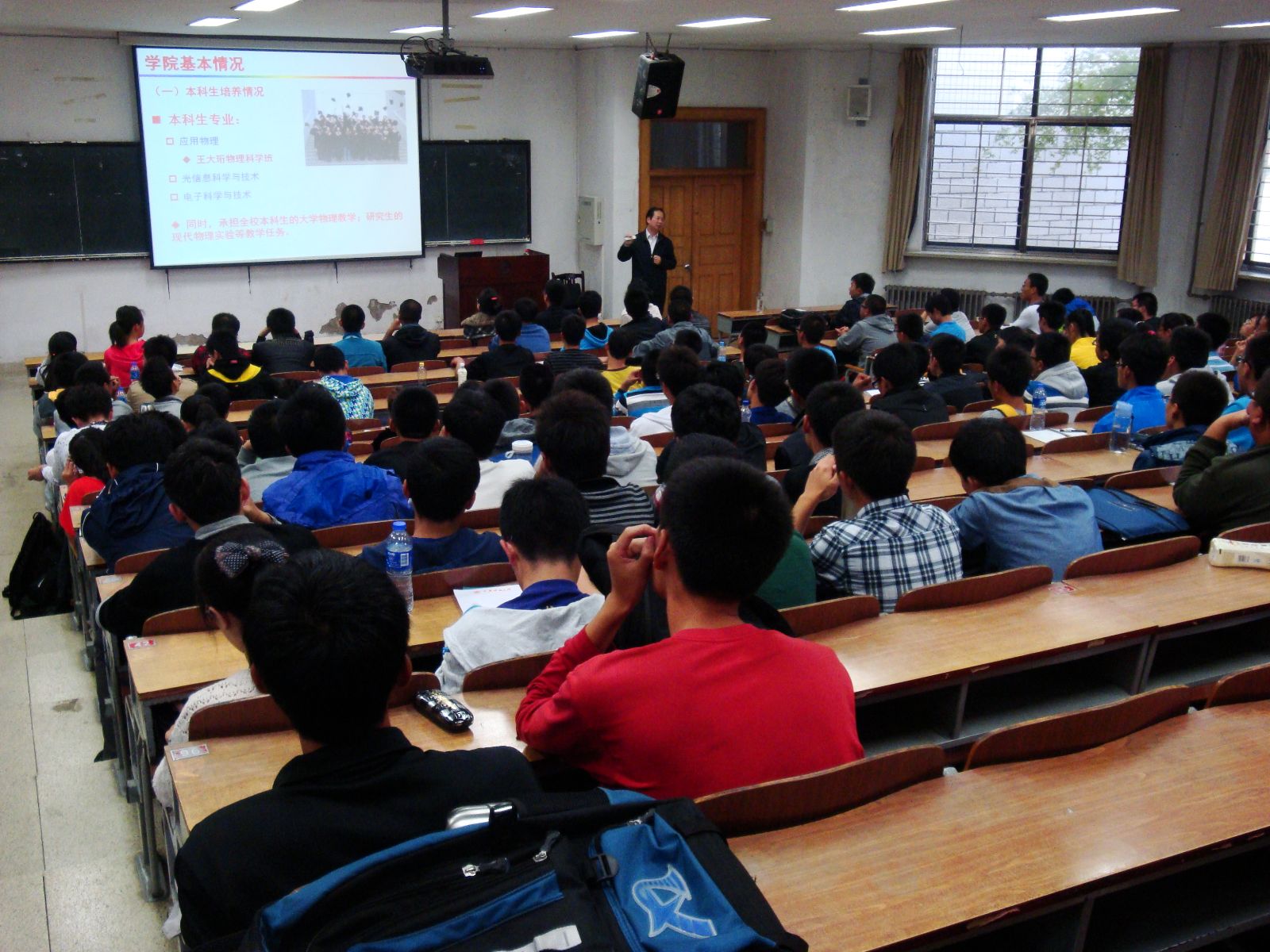 赵院长精彩的讲座赢得了新生们经久不息的掌声。本次活动让学院全体新生对学院在人才培养、学科建设、科学研究等方面都有了深入的认识,也让学生了解了物理学科领域的活力和巨大的发展空间,增强了专业兴趣和信心。2013级新生李晓龙听完报告后,激动地说:物理专业并不是我的理想专业,很多周围的人都告诉我“学物理就业难”,因此从接到录取通知书的时刻起,我就暗下决心,一定要通过自己的努力,将来获得转专业的机会。今天,听完院长激情洋溢的讲座,我感到内心充满了动力,我渴望未来用自己的物理知识去改变人类的生活,我打算从今天开始,不再抵触和抗拒,克服专业情绪,真正的走进物理殿堂。