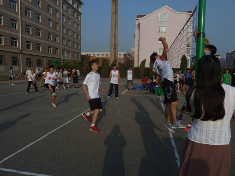 下午4点,第一局比赛提前打响,物理排球队赢得球权,物理排球队队长李昭阳同学发球,一发成功!物理队率先得分。这个球大大提升了队员们的士气,物理队随后发起了猛攻,打了一波6比0的小高潮,逼得数学队提前派上主力队员。之后数学队开始得分,双方的比分交替上升。但由于物理队球员们体力不支,开始频繁换人。此时数学队奋起反击,最后终于反超物理队。并在最后物理队的一个扣杀失误之后,比分锁定在21比25。数学科学学院先下一城。