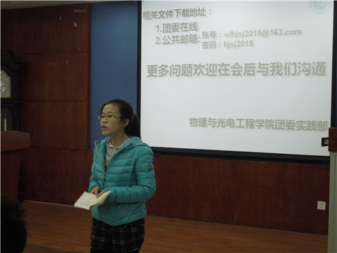 12月23日晚,由物理与光电工程学院团委实践部举办的寒假社会实践宣讲会于物理系楼322举行,出席本次宣讲会的嘉宾有物理与光电工程学院团委常务副书记罗雨清、团委实践部部长张旭及校团委实践中心副主任孙哲浩。本次宣讲会旨在让同学们了解寒假社会实践的具体内容,明确实践活动如何开展以及鼓励同学们积极参与。