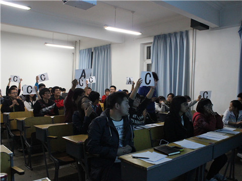 在一片焦急的等待中,比赛拉开帷幕。本场比赛共分为必答题、抢答题、风险题、理论演讲题以及理论互动环节。主持人介绍规则后,比赛便正式开始。面对类型多变,内容繁杂的问题,参加比赛的同学以小组为单位纷纷积极地召开了讨论,在规定的时间后举牌回答。面对看似烦闷枯燥的问题,大家激烈的讨论和竞争却使比赛氛围轻松活跃。思考时的眉头紧锁,获得答案时的朗朗欢笑,都使这场比赛显得无限生动而精彩,也拥有了超乎于比赛本身的魅力,在严肃与欢乐的交织中学习和成长。