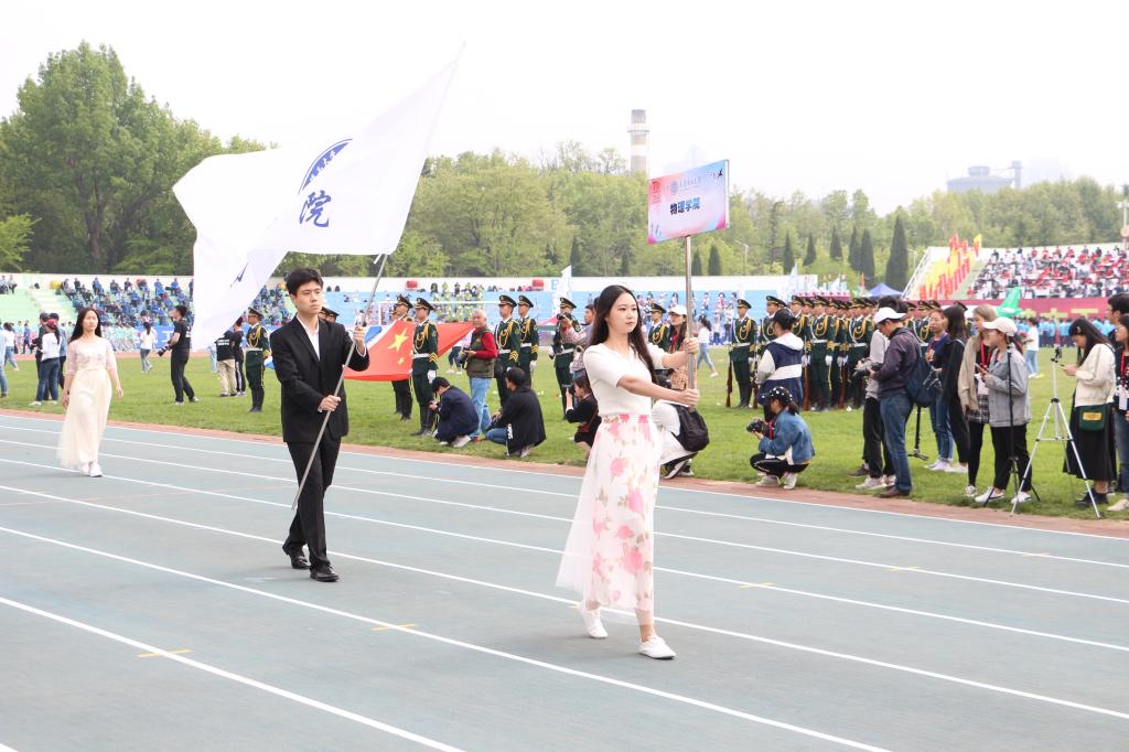 开幕式在各个学部学院方队的缤纷展示中宣告开始。新葡的京集团8814检测站方队由64名队员组成,一人持新葡的京集团8814检测站标牌,一人持新葡的京集团8814检测站院旗,携两名少女引路,紧随着由十六个旗手抬起的四面大旗。在最后,方队成员手握新葡的京集团8814检测站院旗昂首挺胸阔步向前。“外现于物,内秀于里,内外兼修,唯我物理”的响亮口号回荡在体育场的上空,他们用他们的蓬勃朝气诠释出物理的严谨与美丽,彰显着物理学子饱满的竞争热情与活力。之后,所有的观众在指定区域落座,运动会开幕式正式开始。在极具创造性的节奏体语结束后,各学院组成的舞蹈队上前表演,展示我校学子独特的青春激情。开幕式在全校的合唱中结束,运动会正式开始。