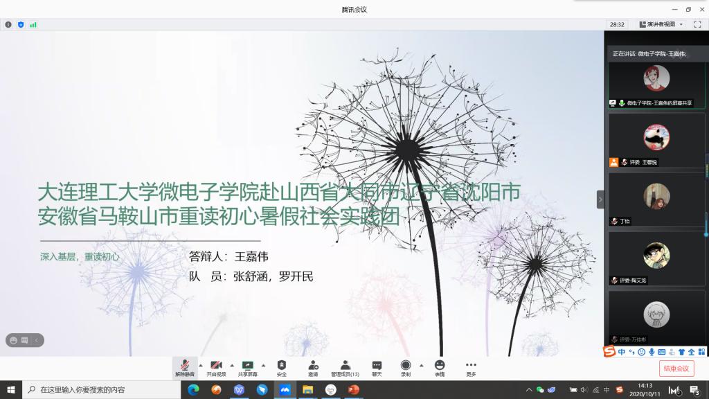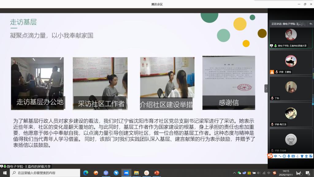 为调动同学参与社会实践的热情,对实践活动完成优秀的同学进行嘉奖,新葡的京集团8814检测站团委实践部于10月11日下午14:00采取腾讯会议形式举办与微电子学院互评的2020暑期社会实践评优线上答辩会。出席此次答辩的嘉宾有新葡的京集团8814检测站团委副书记、2017级队辅导员唐健璐老师,新葡的京集团8814检测站团委常务副书记陶艾龙,新葡的京集团8814检测站学生会轮值主席兼办公室与权益部负责人万佳彬,新葡的京集团8814检测站组织部负责人肖宇环,新葡的京集团8814检测站青协负责人陈杨天。本场答辩的主持人为新葡的京集团8814检测站实践部负责人王馨悦。