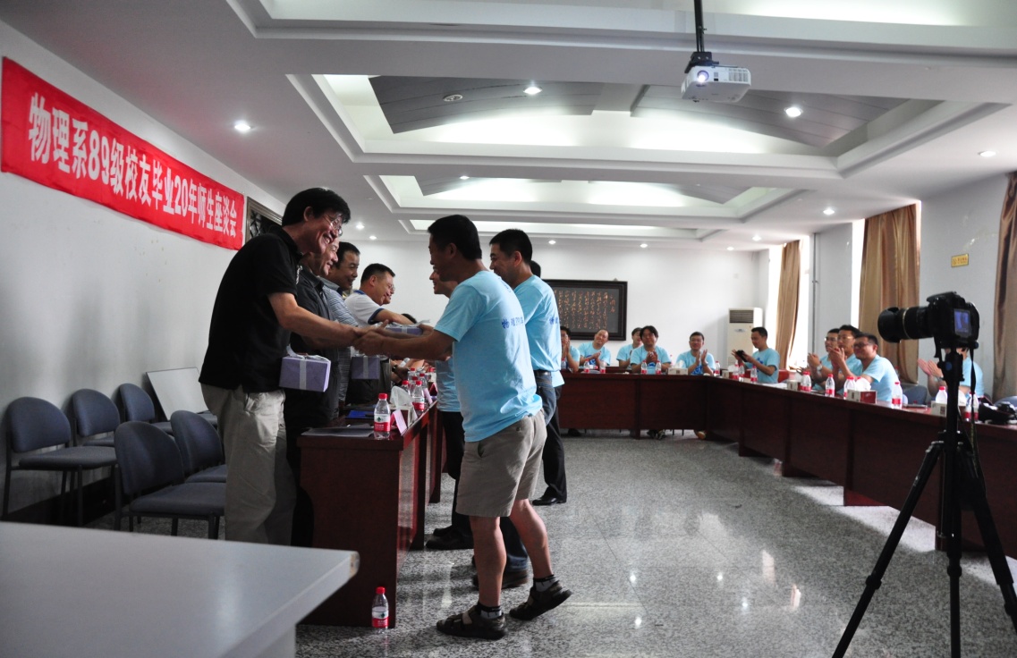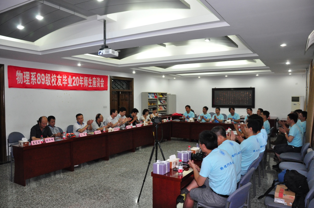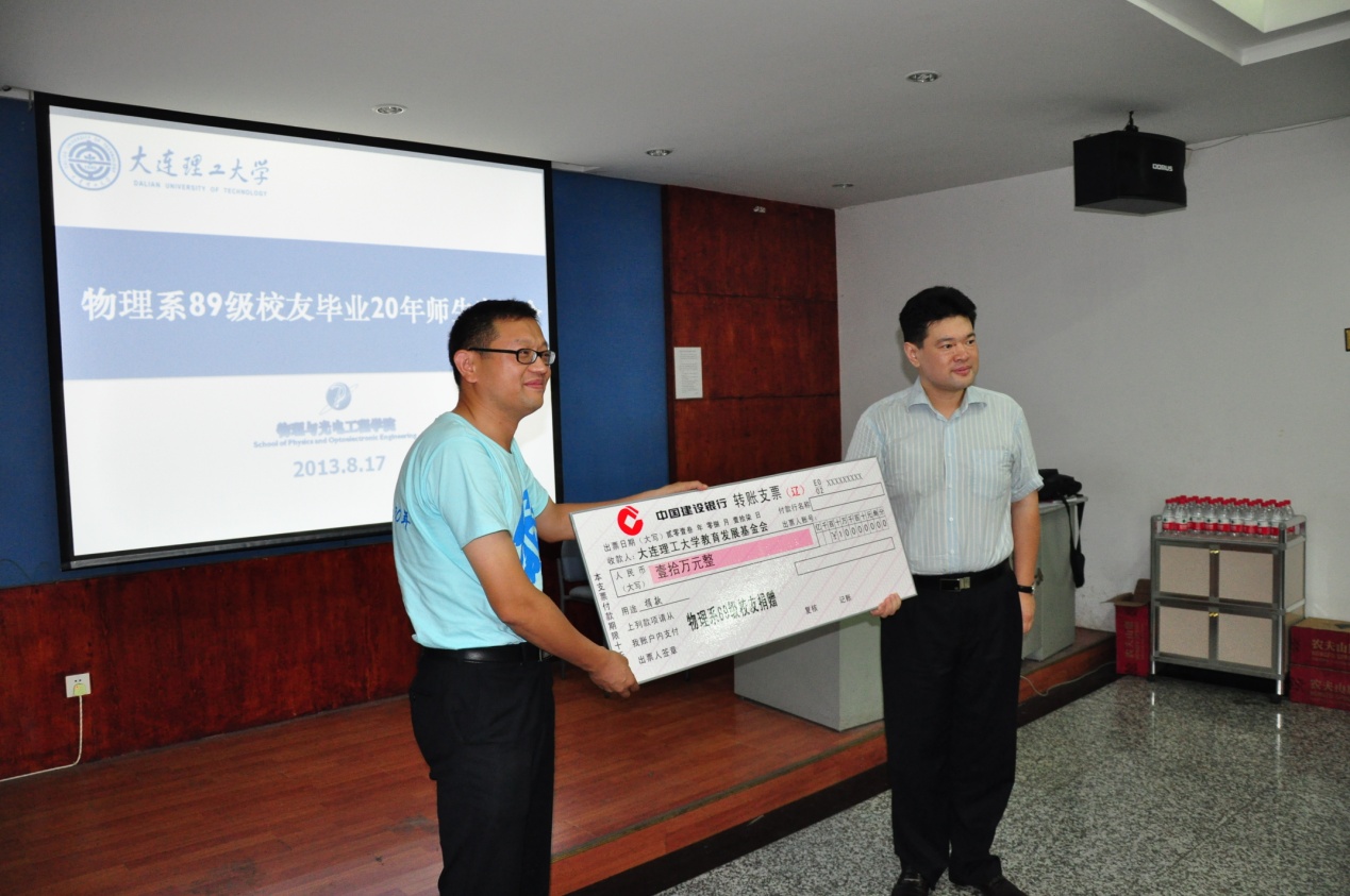 恳谈会由89级1班曾经的团支部书记解春禹主持,作为开场白,老支书与老班长共同发表了热情洋溢、声情并茂的返校感言。物理与光电工程学院院长赵明山教授代表全院师生对89级校友重返母校表示热烈欢迎,并向校友详细地介绍了学院和母校20年来取得的成绩。会上,现任北京创意博科技能源有限公司董事长的原班长邹怀松作为校友代表发言,对学校和学院的培养以及对本次返校活动的大力支持表示由衷感谢;同时,他宣布由物理89级全体校友共同设立了“物理89级校友基金”,主要面向物理与光电工程学院的优秀学生标兵设立专项奖学金,并对学院的物理嘉年华文化品牌活动予以支持,本次捐赠金额10万元。会上,翟刚军老师代表新葡的京集团8814检测站教育发展基金会接受了校友的捐助。
