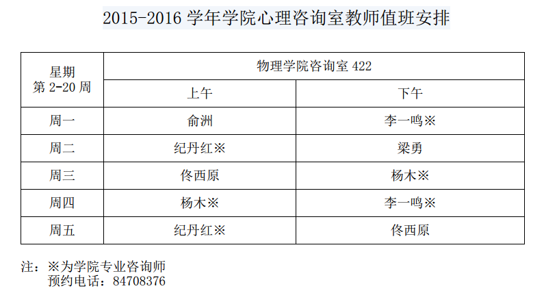 2015-2016学年学院心理咨询室教师值班安排