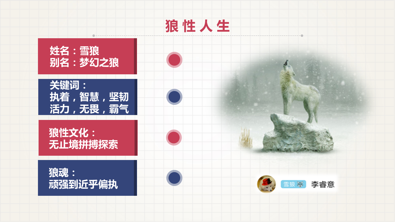 有一个追求卓越的女孩,选择远方,风雨兼程。她喜欢狼,喜欢无止境拼搏的狼性,喜欢顽强到近乎偏执的狼魂。她赋予自己雪狼的标签。渴望如狼一般在草原上奔跑。